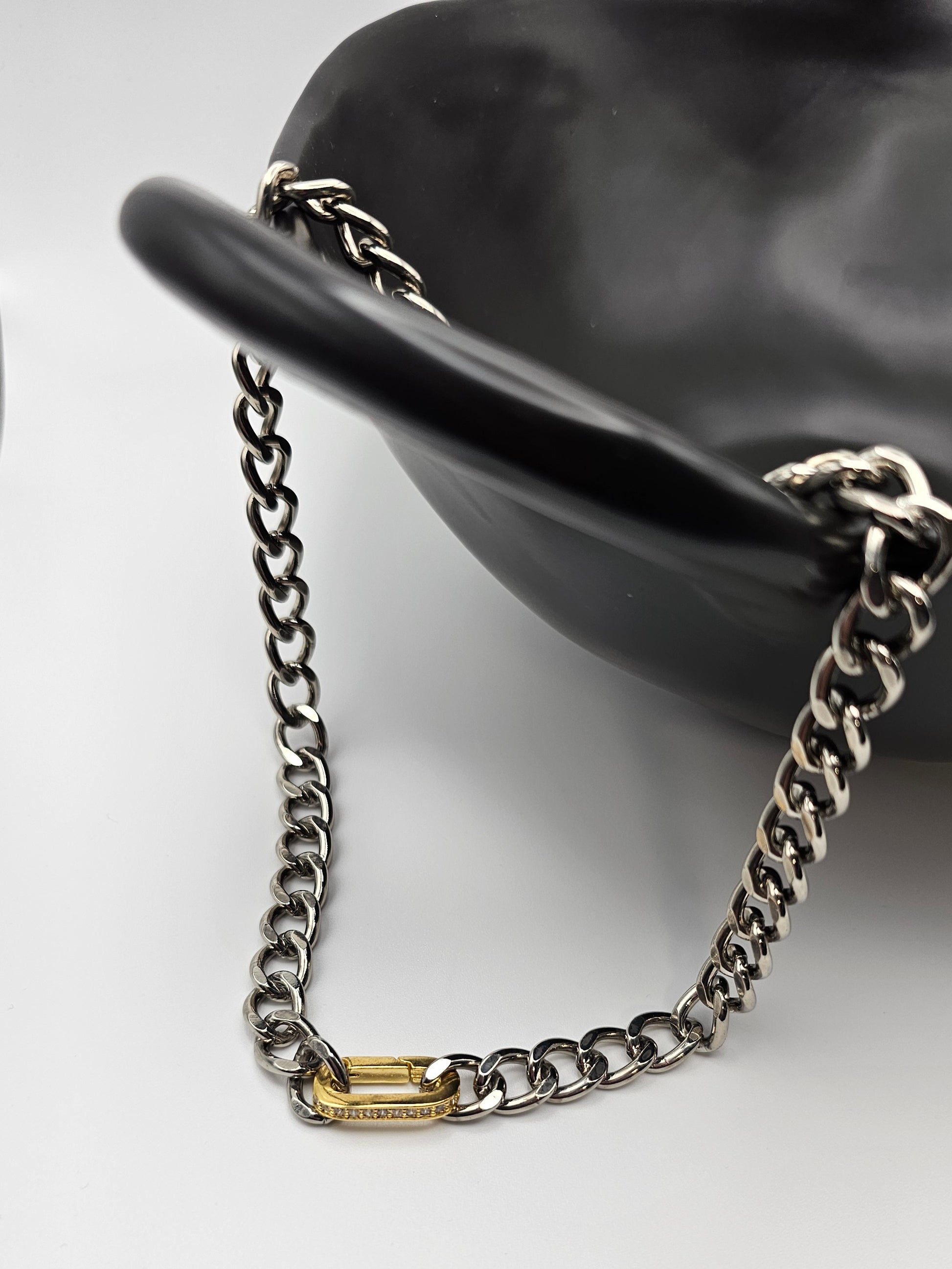 Crafted with a substantial, high-polished silver-tone chain, the necklace commands attention with its confident presence. The classic curb link design offers a timeless appeal, while the focal point — a distinctive rectangular gold filled carabiner clasp — elevates the piece with an unexpected modern twist. Adorned with subtle, shimmering pavé details, this unique clasp not only serves as a secure closure but also as a dazzling highlight, catching the light with every movement.