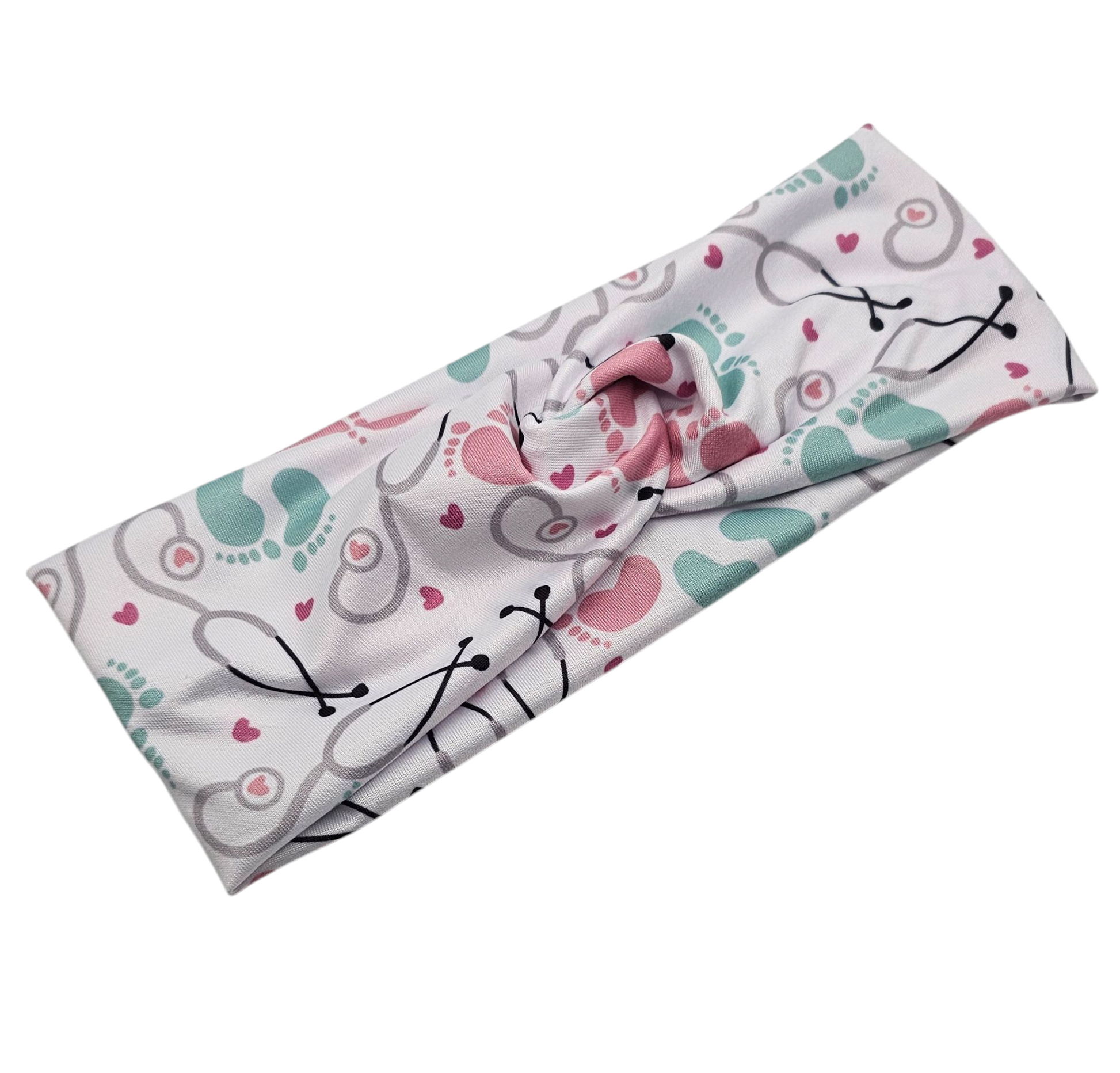 One size fits most design. Machine washable & made from a buttery-soft, ultra stretchy, poly-knit blend. Versatile 3-in-1 twist style provides multiple ways to wear. Double-layer fabric is sweat absorbent and non-slip. Perfect for your best workout, your longest shift or your cutest play date. Handmade in Washington State. Sizes: Women: 3.5" at widest part. Child (ages 4-10): 3" at widest part and smaller/tighter than the women’s size.